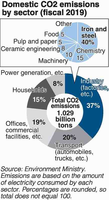 The iron and steel industry accounts for 40% of carbon dioxide emissions generated by the industry sector in Japan.