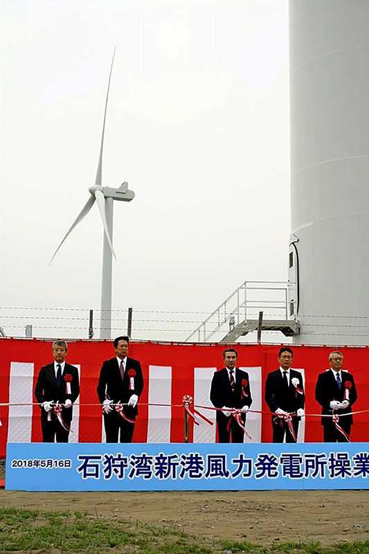 The opening ceremony of a wind power plant is held in the Ishikari Bay New Port district, in Hokkaido, in May 2018.