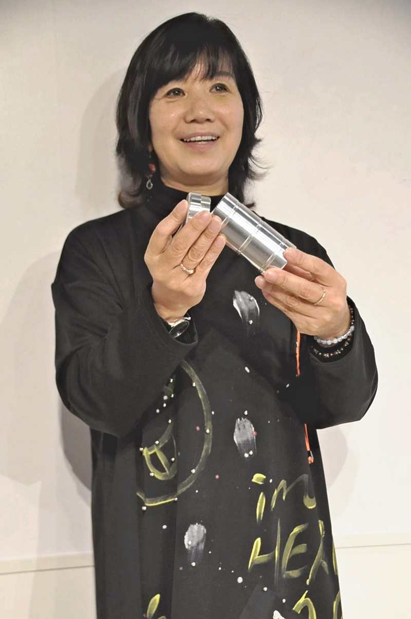 Tomoko Kasai, president of Space NTK Co., holds a container in which cremated human or pet remains may be placed, in Tsukuba, Ibaraki Prefecture.