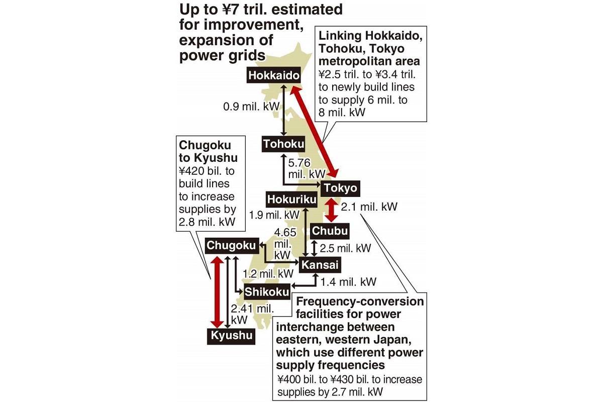 Japan plans to raise the share of renewable energy sources to 36%-38% by fiscal 2030, about double the fiscal 2019 level. Projections made last year estimate that about ¥6 trillion to ¥7 trillion will be needed to develop the electricity transmission network.