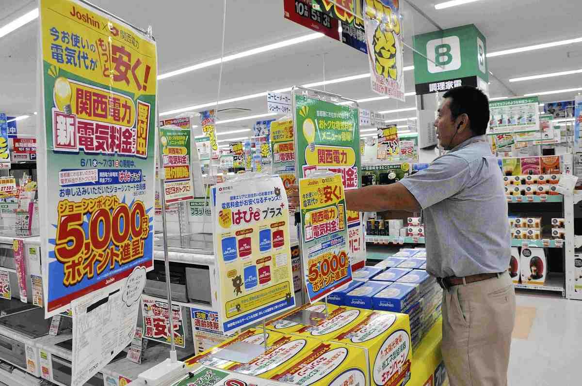 Advertisements by Kansai Electric Power Co. are seen at an electronics retail store in Itabashi Ward, Tokyo, in June 2016 touting its lower rates in the service area of Tokyo Electric Power Company Holdings, Inc.
