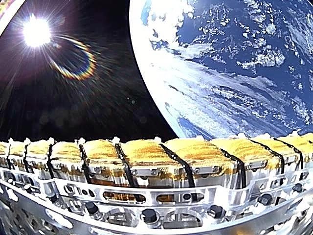 Space and Earth are seen in an image photographed by an iQPS satellite. The object at the bottom of the image is part of the satellite.