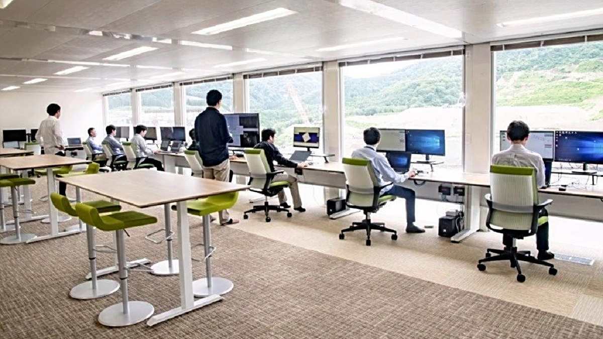 In July, Kajima Corp. installed unmanned machinery for construction of the Naruse Dam in Higashi-Naruse, Akita Prefecture. About eight heavy machines, including dump trucks, bulldozers and rollers, work together to carry, spread and harden cemented gravel. Their movements are programmed in advance, and workers monitor the operations from a remote control room.