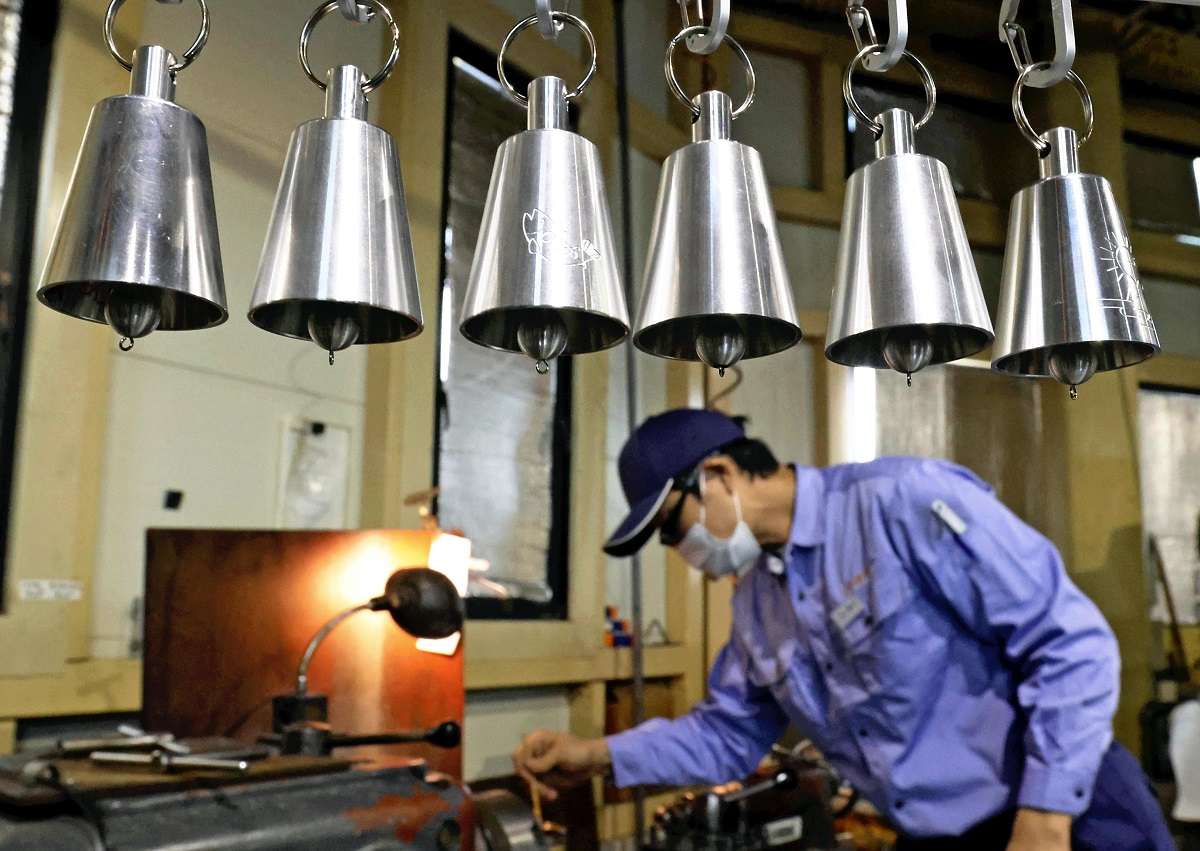 Bear bells hang at Daiki Seiko Co.’s factory in Komaki, Aichi Prefecture.