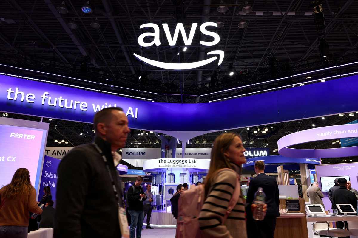 People walk by the exhibit for Amazon Web Services at National Retail Federation 2026: Retail’s Big Show, in New York City, on Jan. 12