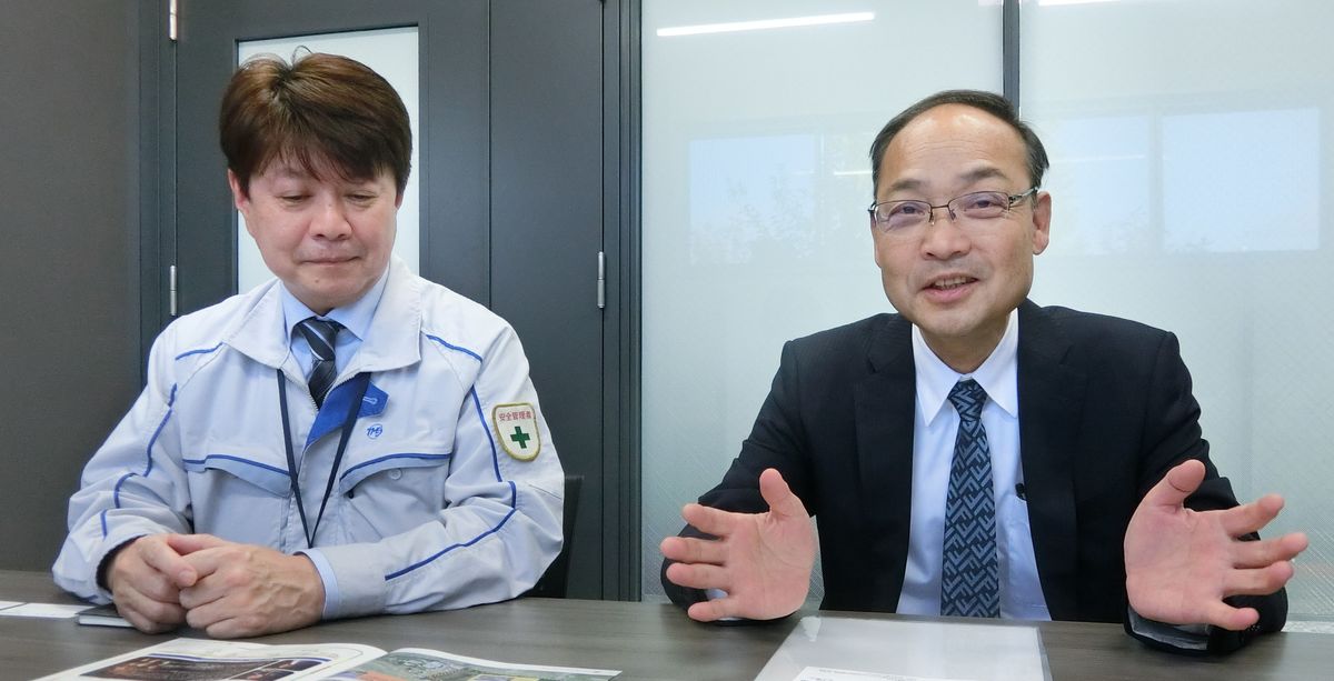 Shigezo Abe, right, who was the general manager of Toyota Motor East Japan Inc.’s Higashi-Fuji Plant at the time of its closure, speaks in Ohira, Miyagi Prefecture. At left is Takashi Uchiyama, then assembly section manager at the plant.