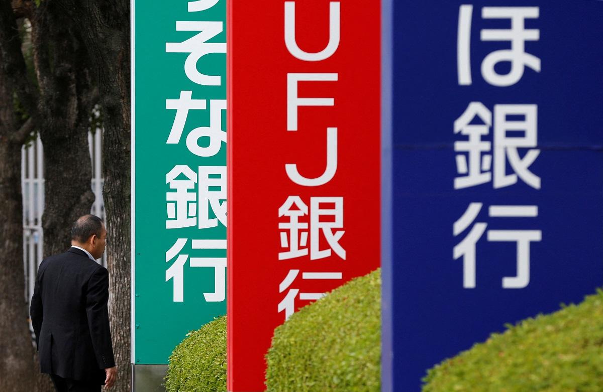 A man walks past signboards of Resona Bank (green), MUFG Bank (red) and Mizuho Bank (blue) in Tokyo.