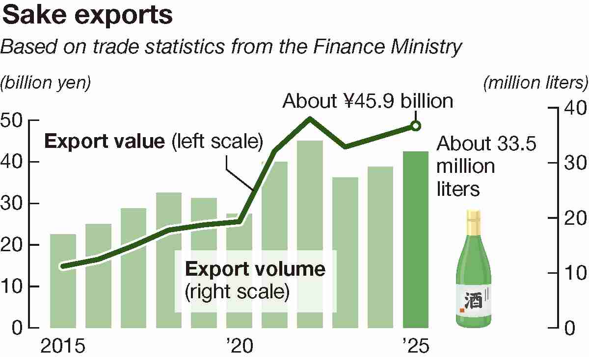 In 2025, sake export volume rose 8% from a year earlier to about 33.5 million liters, while export value increased 6% to about ¥45.9 billion, according to the Japan Sake and Shochu Makers Association. Both figures approached record highs set in 2022.