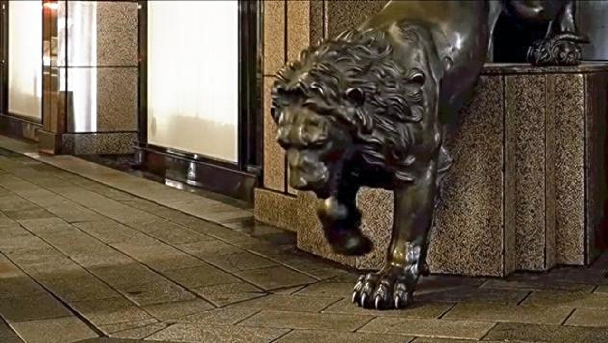 The video depicts the lion statue descending from its pedestal.