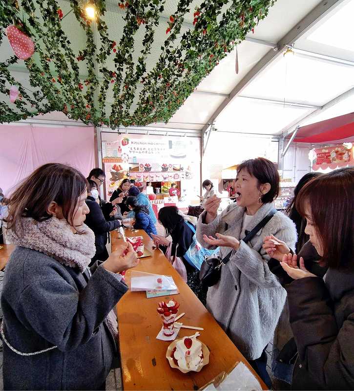 The popular strawberry festival attracted about 580,000 visitors last year. Tochigi Prefecture brought its flagship Tochiaika strawberry, aiming to increase its name recognition among consumers through food samples and direct sales. “The Yokohama Red Brick Warehouse looks great in photos, and we hope that people will talk about Tochiaika on social media,” a prefectural government official said.