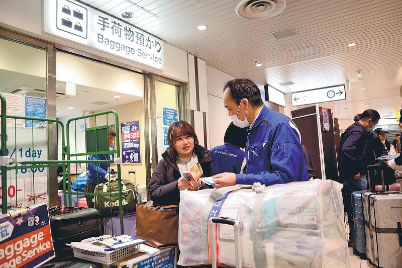 A woman from Taiwan drops off a suitcase and other items and applies for airport delivery at Keisei Ueno Station in Taito Ward, Tokyo.