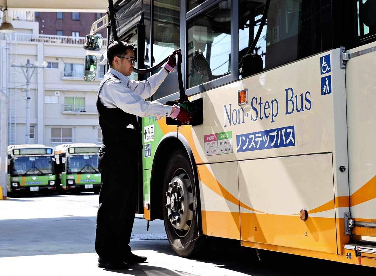 A driver of a Toei bus refuels in Toshima Ward, Tokyo, on Friday.