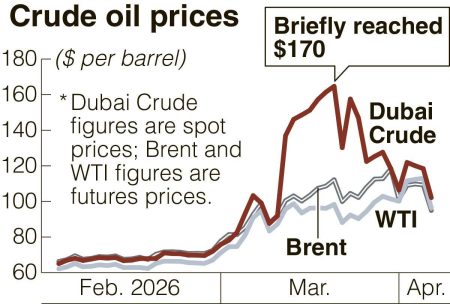 Dubai Crude spot prices were about $70 per barrel in late February, before the United States and Israel attacked Iran and Tehran responded with attacks against countries across the Middle East. This price topped $170 at one point in mid-March. One barrel holds about 159 liters. Although prices for WTI and Brent also soared during that period, Dubai was about $60 to $70 more expensive than both.