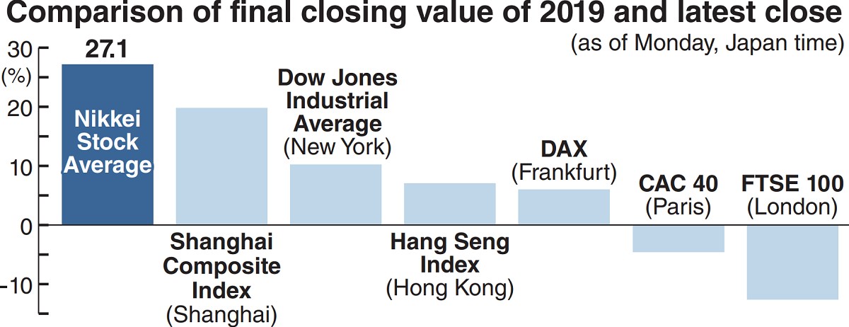 Central banks around the world have stepped up monetary easing to support their economies due to the effects of the pandemic. Although stock indexes have also risen in the United States and China, the Nikkei Stock Average ended Monday up a whopping 27.1% compared to its final closing value of 2019.