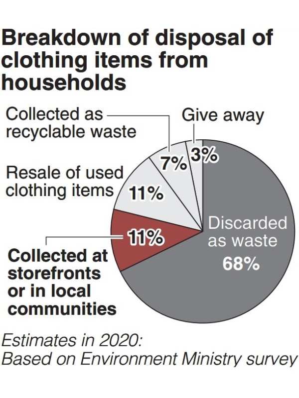 According to the Environment Ministry, 810,000 tons of clothing items were newly delivered in Japan in 2020. It is estimated that clothing disposed of by households reached 750,000 tons while that from offices measured 30,000 tons.