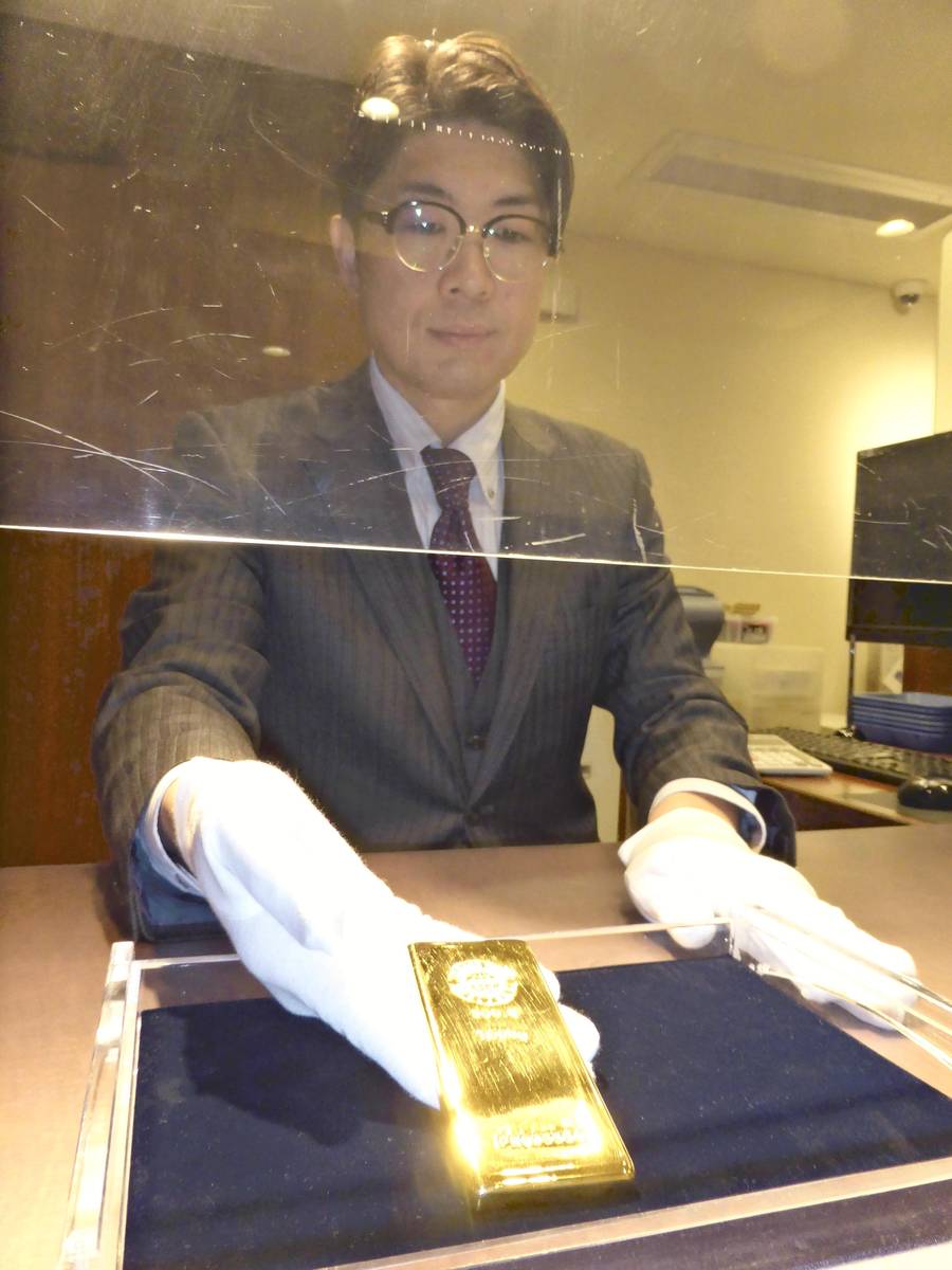 A gold bar is seen at the Ginza main shop of Tanaka Precious Metal Technologies Co. in Tokyo.
