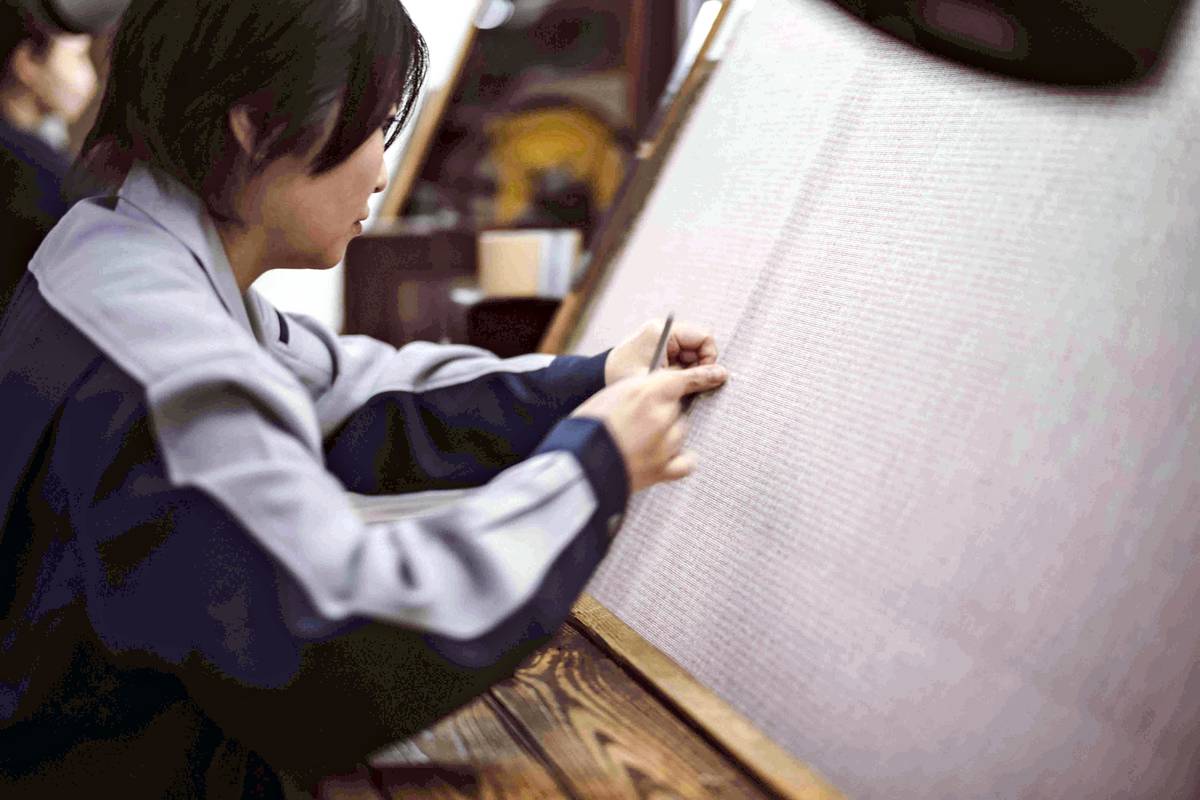 Kojima Orimono Co.’s woven wallpaper is made by skilled craftspeople.