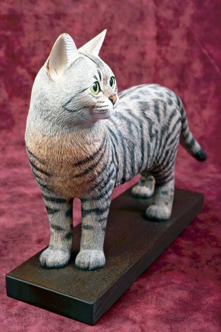 One of the wooden cat statues made by Nishi. The fur is depicted very realistically.