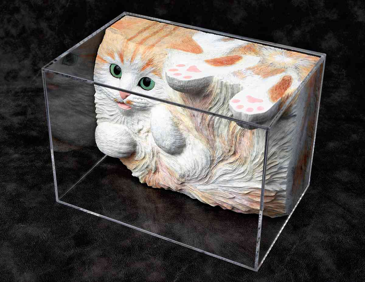 Cats have elastic bodies. In these photos, the carved cat statues fit amusingly into the acrylic display cases.