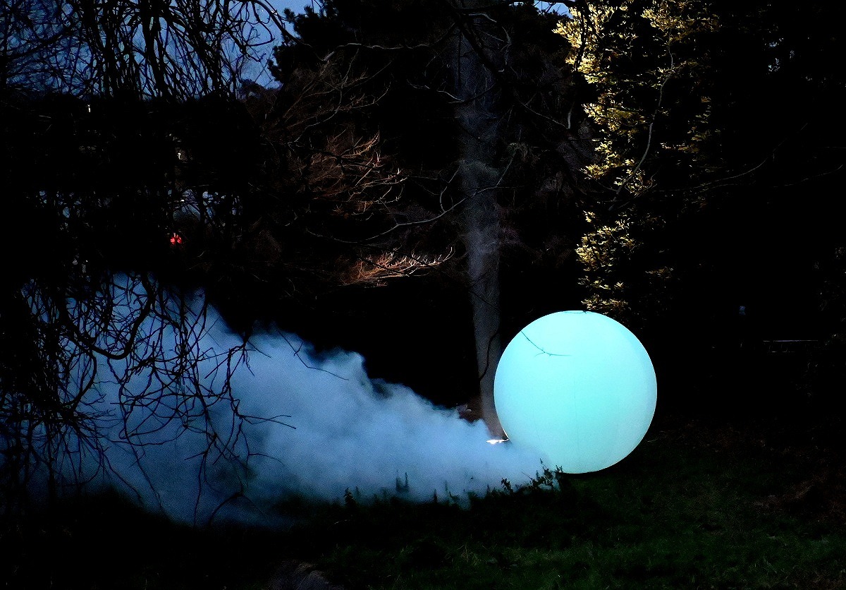 A large sphere flashes green while emitting smoke and light in the forest of Umi-no-Mori Park in Koto Ward, Tokyo, on Friday.