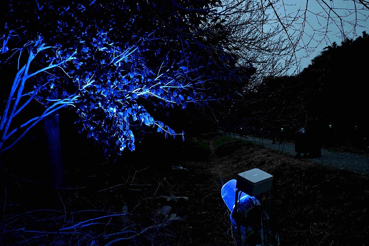 A tree illuminated by blue light