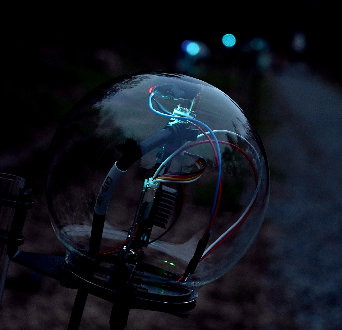 Along the straight path through the forest, rows of smaller transparent spheres glowed green, occasionally illuminating the trees on either side in blue.