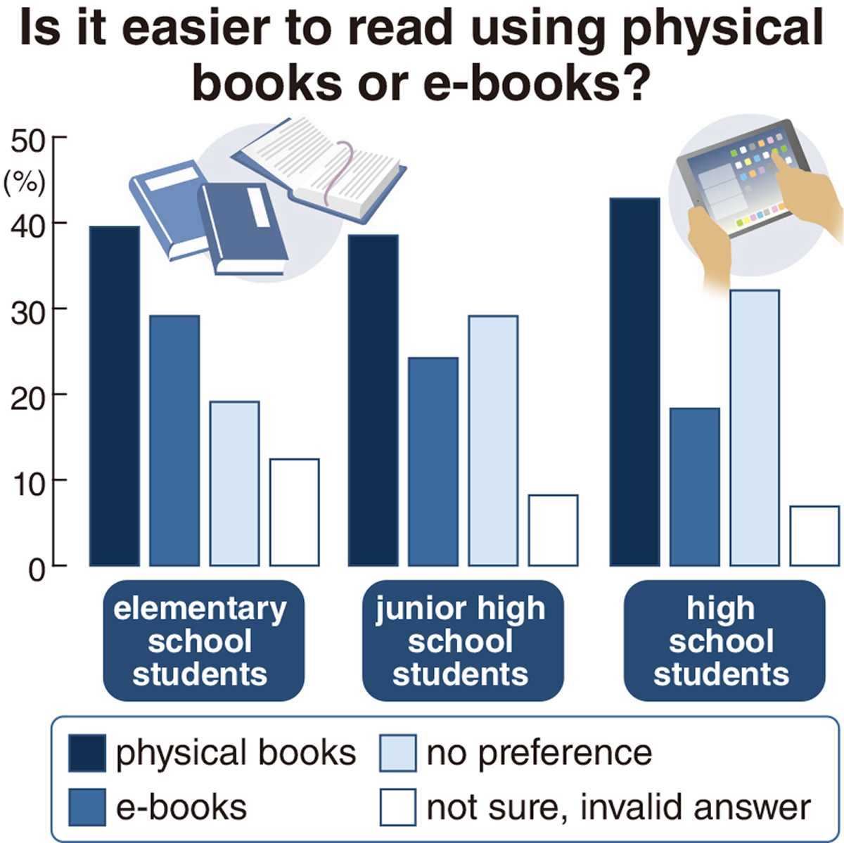 The number of elementary school students who responded that reading novels was easier on physical books was 39.5%, with junior high school students at 38.5% and high school students at 42.8%. In each group, the number of students who preferred reading physical books was much greater than those who preferred to read e-books and those who responded that they had no preference.