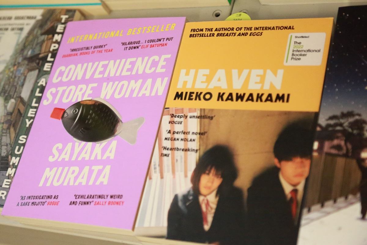 Books by Sayaka Murata and Mieko Kawakami are seen at the Maruzen Marunouchi Main Store in Tokyo in May.