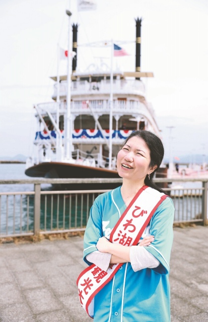 The Michigan Cruise, a Lake Biwa sightseeing boat, glides leisurely over the lake’s endless blue surface. Miyajima showed up to Otsu Port in Otsu, wearing a shirt that resembles a baseball uniform and a sash over her shoulder with “Lake Biwa Otsu Tourism Ambassador” written on it.
