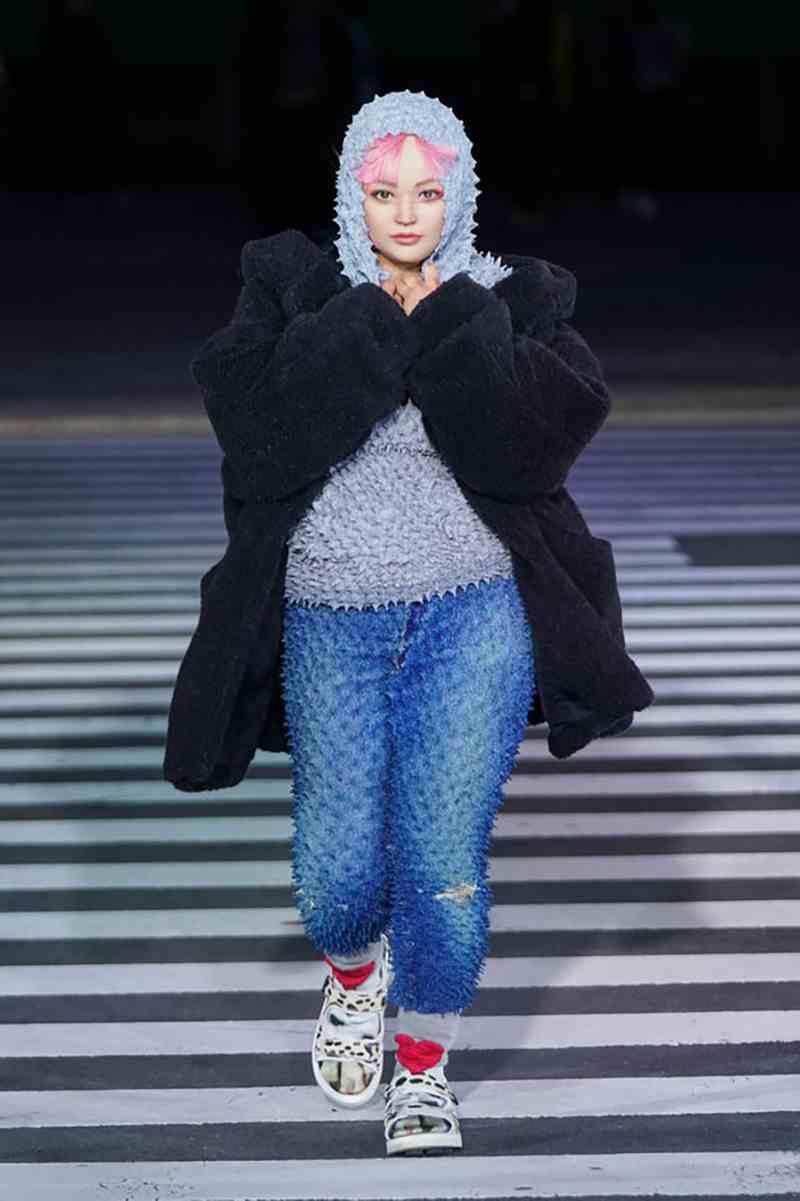 It was not the first time for Doublet to surprise and delight journalists with a show. The brand has showcased collections at all kinds of venues, such as a family restaurant, an amusement park’s haunted house with zombies and an organic farm in Mitaka, Tokyo. Those shows also served as some form of social criticism, which is a characteristic of the brand. For example, the theme of the show this time was diversity, so it included plus-size models and models with disabilities. The models all wore a mask of the face of imma, a pink-haired virtual human, which evoked chuckles as it seemed to contradict the event’s theme. When the show ended, the models took off their masks to reveal there were both men and women present.