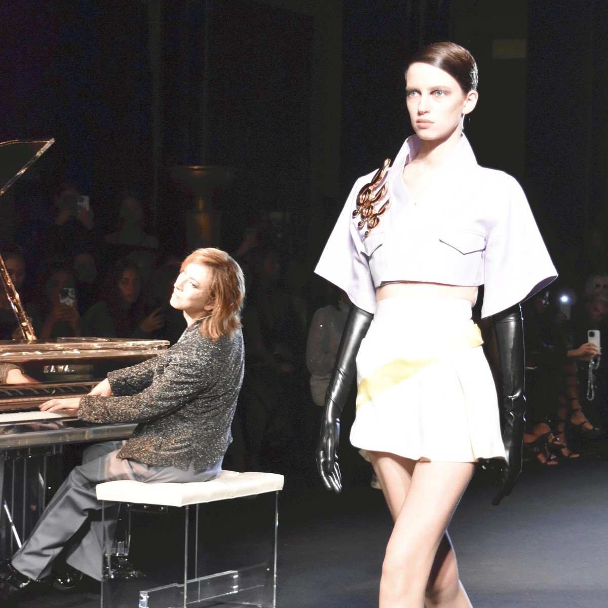 A model walks the runway while Yoshiki plays the piano at Maison Yoshiki Paris’ show in Paris on Monday.