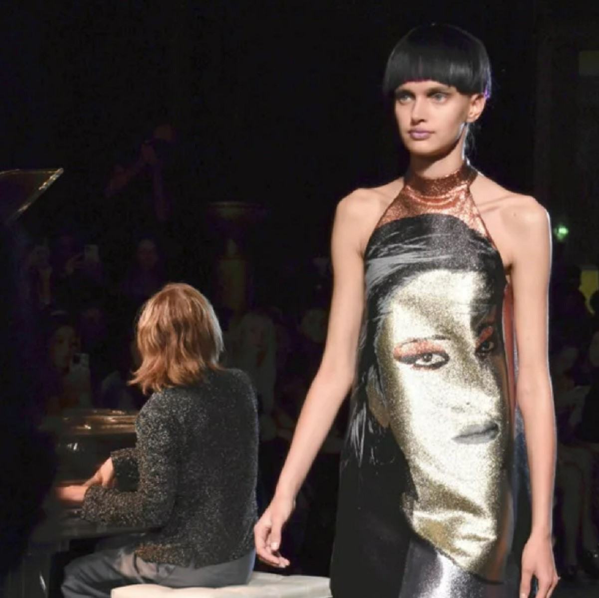 The show was held at a large exhibition hall near the Eiffel Tower. Yoshiki played the piano while models walked the runway wearing various outfits, including kimono-like tops, shirts made of transparent material and a dress featuring a large image of Yoshiki’s face.