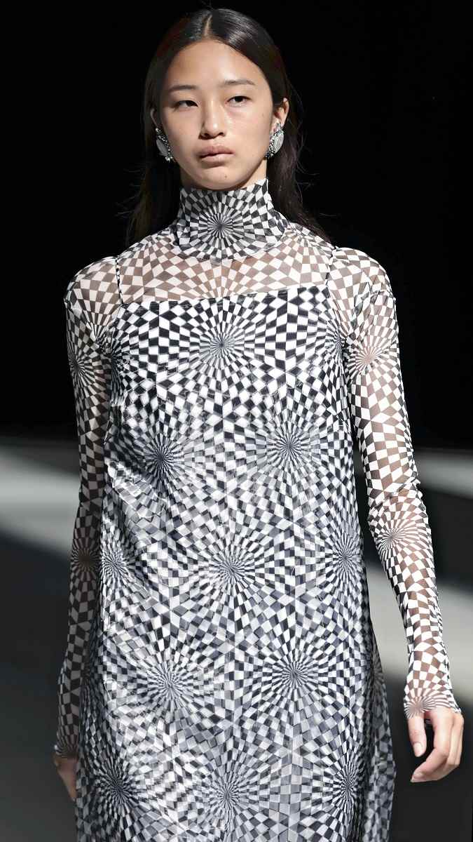 The show also featured a dress made with two layers of sheer fabric that created a pattern like an optical illusion, as well as a top made from cotton jersey treated to resemble sheepskin leather.