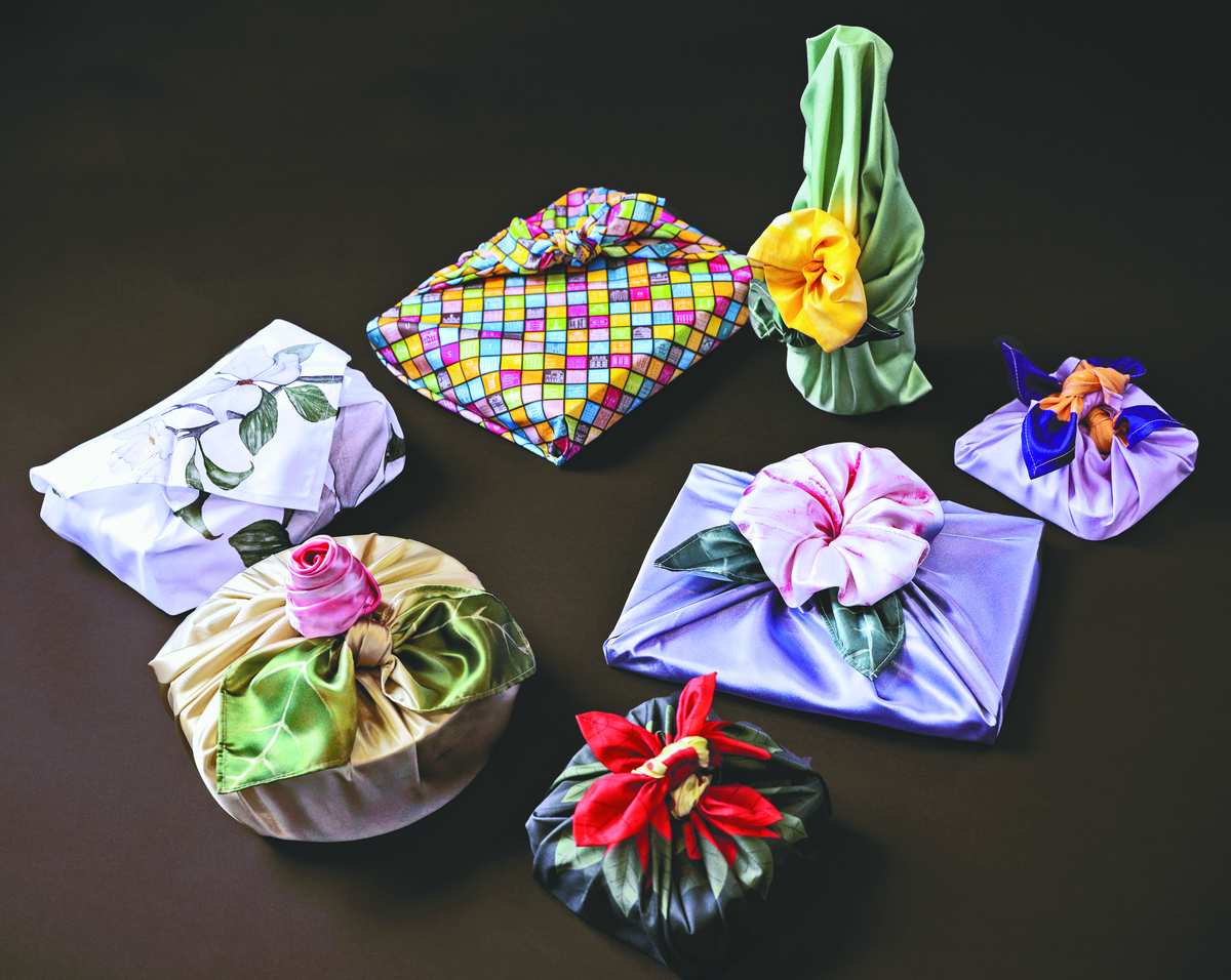 Anna Papai-Vonderviszt, 40, a furoshiki designer from Hungary, presented boxes and books wrapped with furoshiki featuring knots made to look like extravagant flowers, such as dahlias and roses. She also recommended imbuing a scent like rosewater to add extra charm.