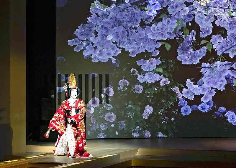 A kabuki performance titled “Moon, Snow and Flowers: Performing Arts Celebrating the Natural Beauty of Japan” was held on Feb. 28 at the National Theatre in Chiyoda Ward, Tokyo. Onoe Kikunosuke, 43, danced gracefully against a backdrop of images of cherry blossoms and falling snow cast on both sides of the stage using projection mapping technology.