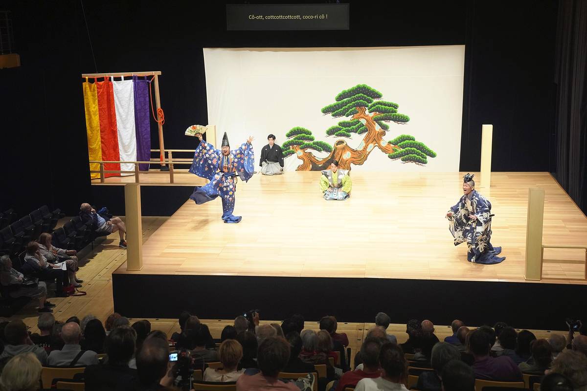 A scene from the kyogen play “Niwatori Muko” (The Rooster Son-in-Law) at the Japan Foundation’s Maison de la culture du Japon in Paris on July 6