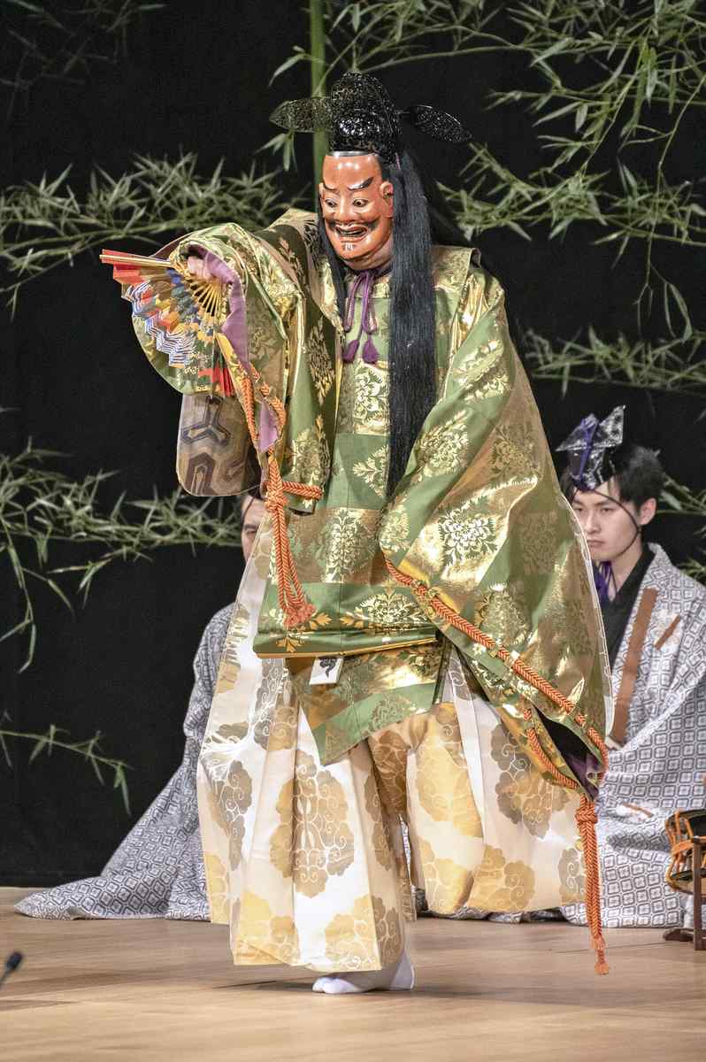 The shite lead role wears a powerful-looking “O-Tenjin” type noh mask.