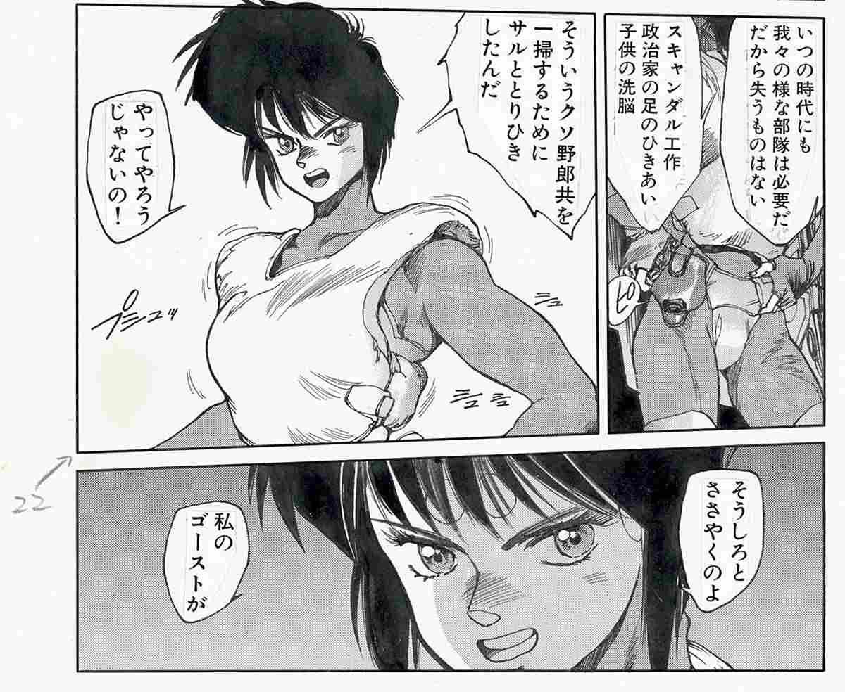 Original frames for a page of Shirow Masamune’s “The Ghost in the Shell” manga, a masterpiece featuring Motoko Kusanagi, a cool, brave cyborg