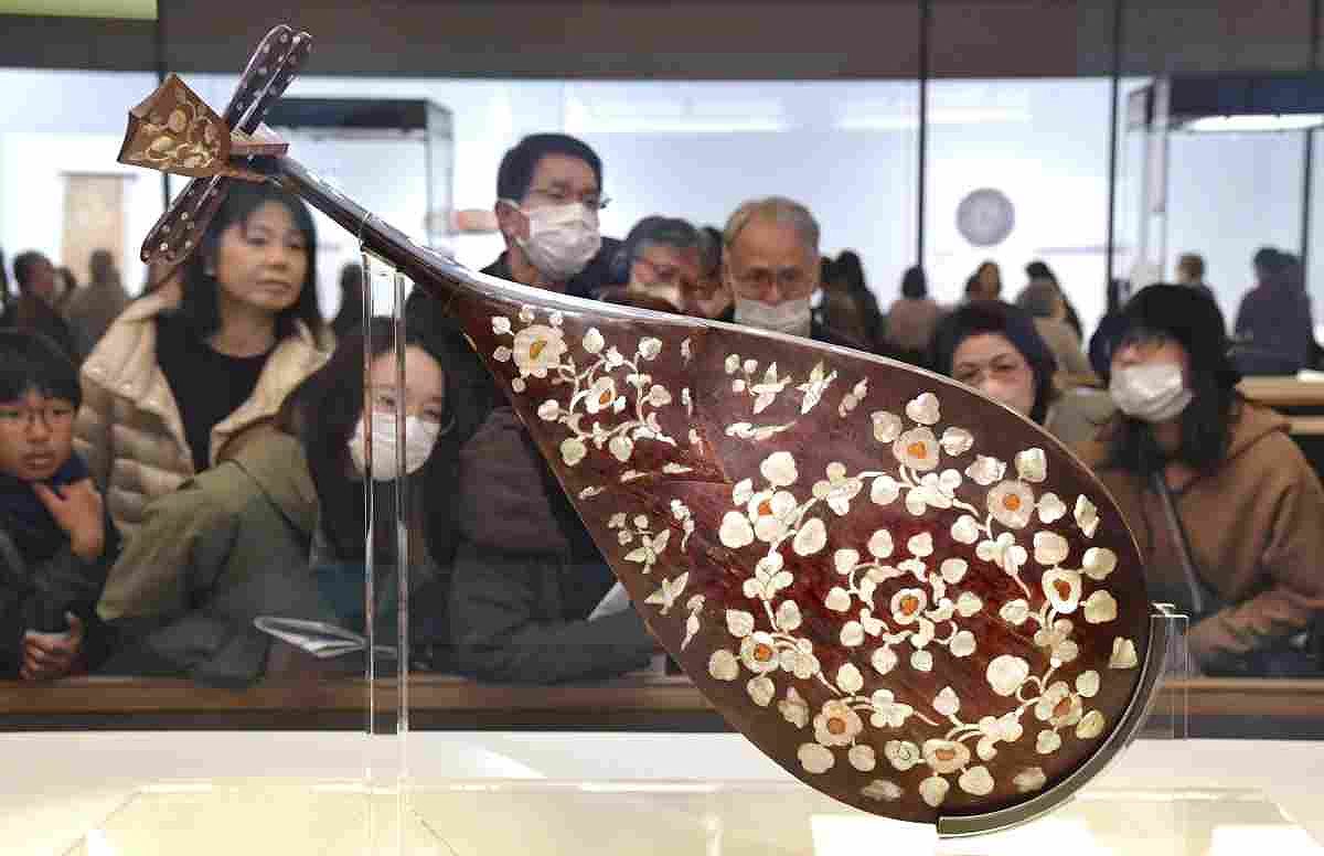 People examine “Biwa Lute Made of Sappan-Stained Maplewood with Mother-of-Pearl and Painting” at the Nara National Museum in Nara on Monday.