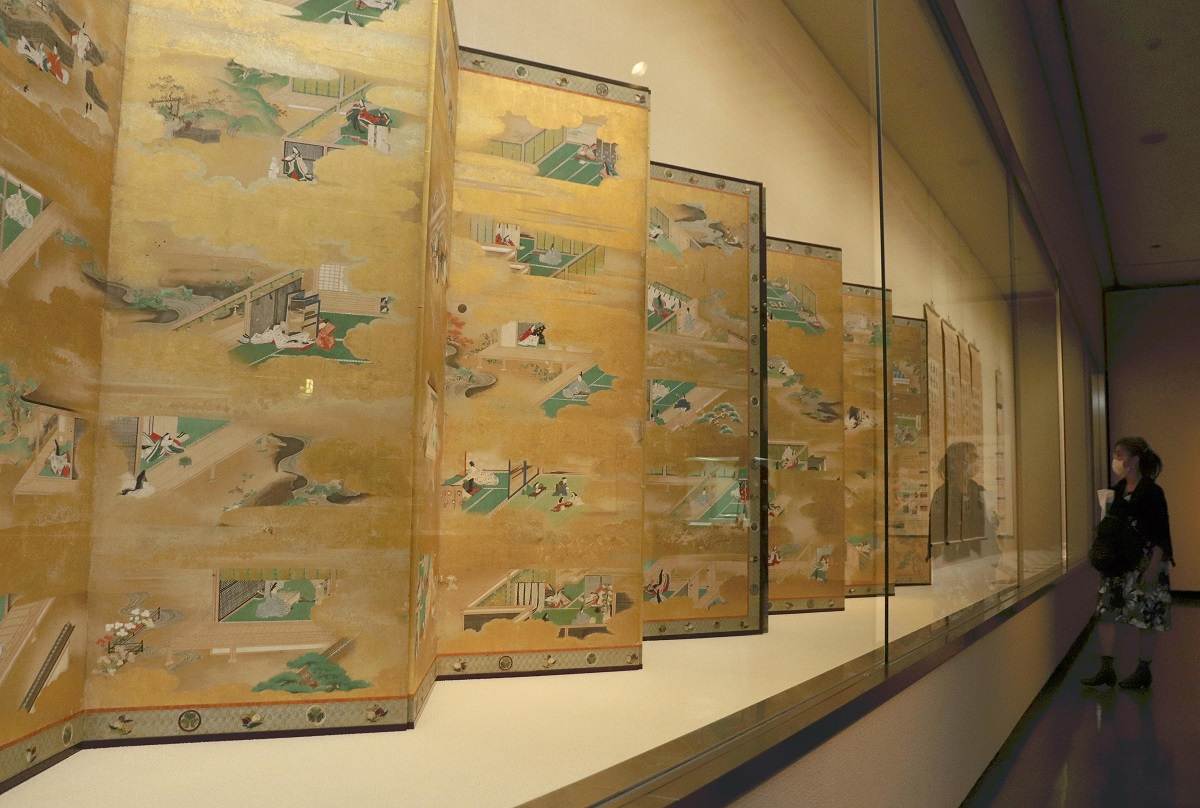 A visitor looks at the “Genji Monogatari-zu Byobu” (Scenes from The Tale of Genji), which is on loan from The Museum of the Imperial Collections at Ishikawa Prefectural Museum of Art in October 2023.