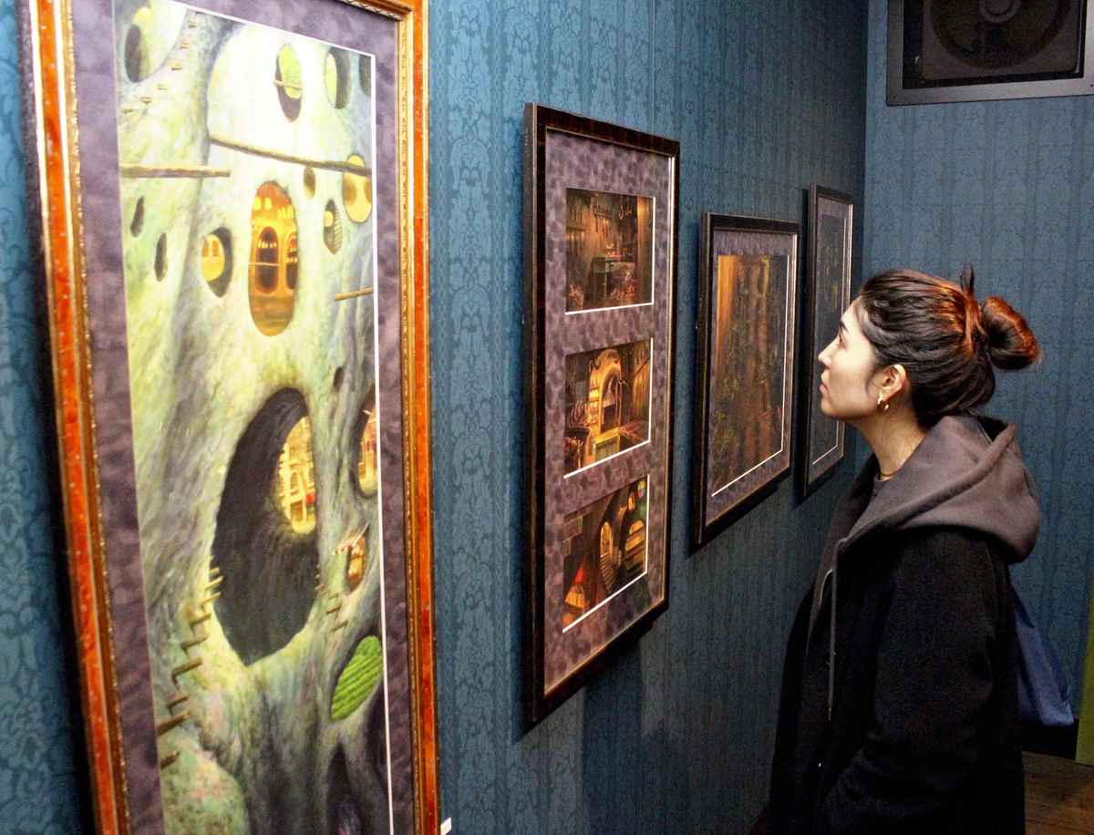 A visitor looks at an exhibit during a preview of “The Boy and the Heron Part 3: Background Art” at the Ghibli Museum, Mitaka, in Mitaka, Tokyo, on Friday.