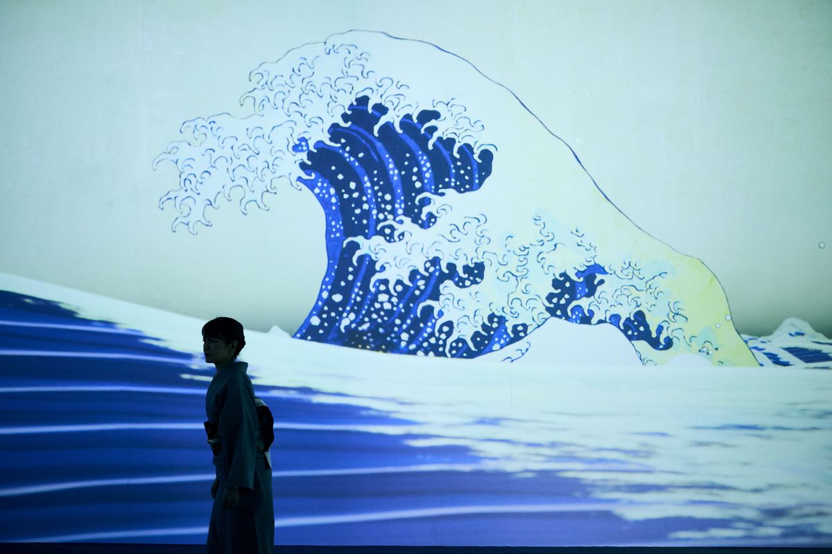 An installation inspired by Katsushika Hokusai’s “The Great Wave off Kanagawa” is on display at the “Ukiyoe Immersive Art Exhibition” at Warehouse Terrada in Tokyo.
