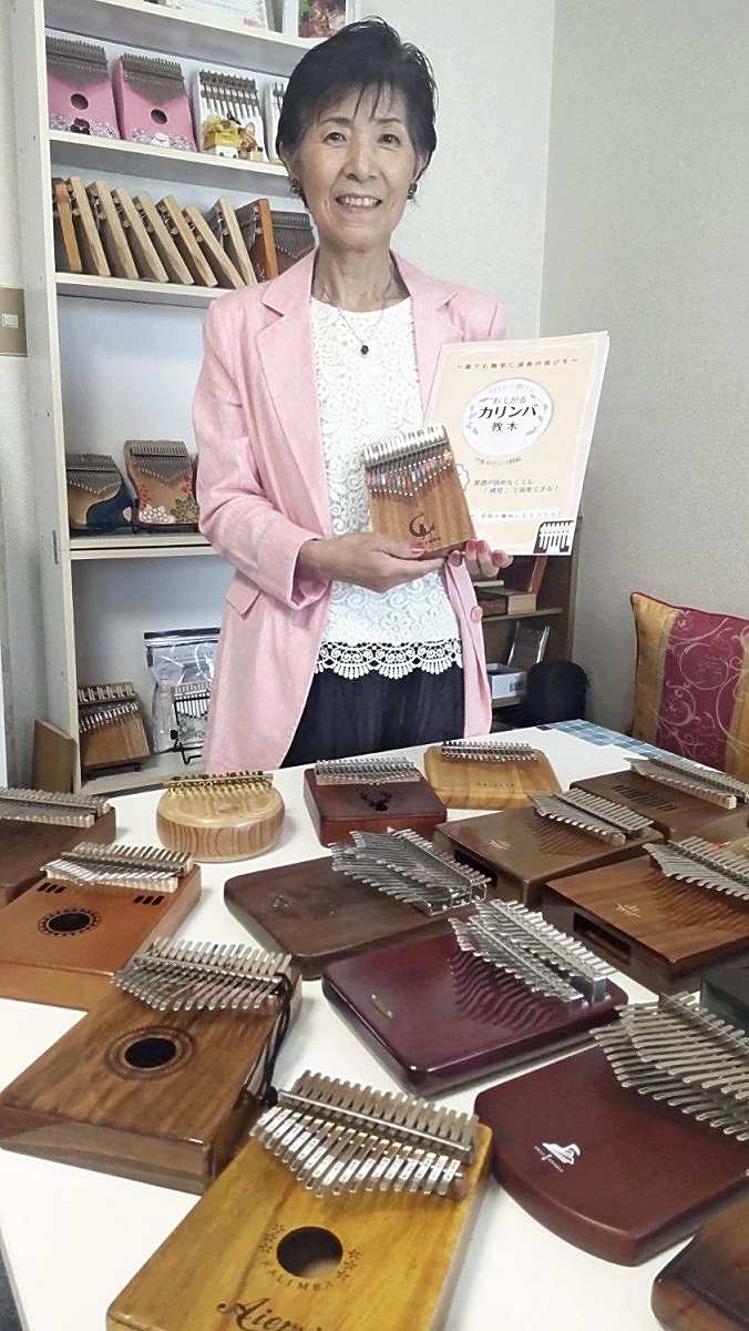 Toshiko Kitamura, the head of “Otegaru Kalimba Society,” poses with various kalimbas.