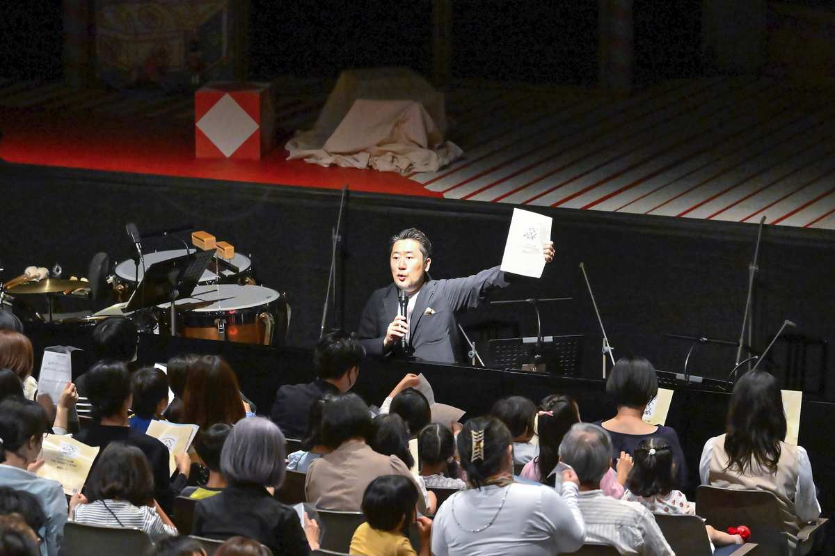 Conductor Kyohei Tomihira teaches the audience “Audience Song I” from Britten’s “The Little Sweep” at the New National Theatre, Tokyo, on May 5.
