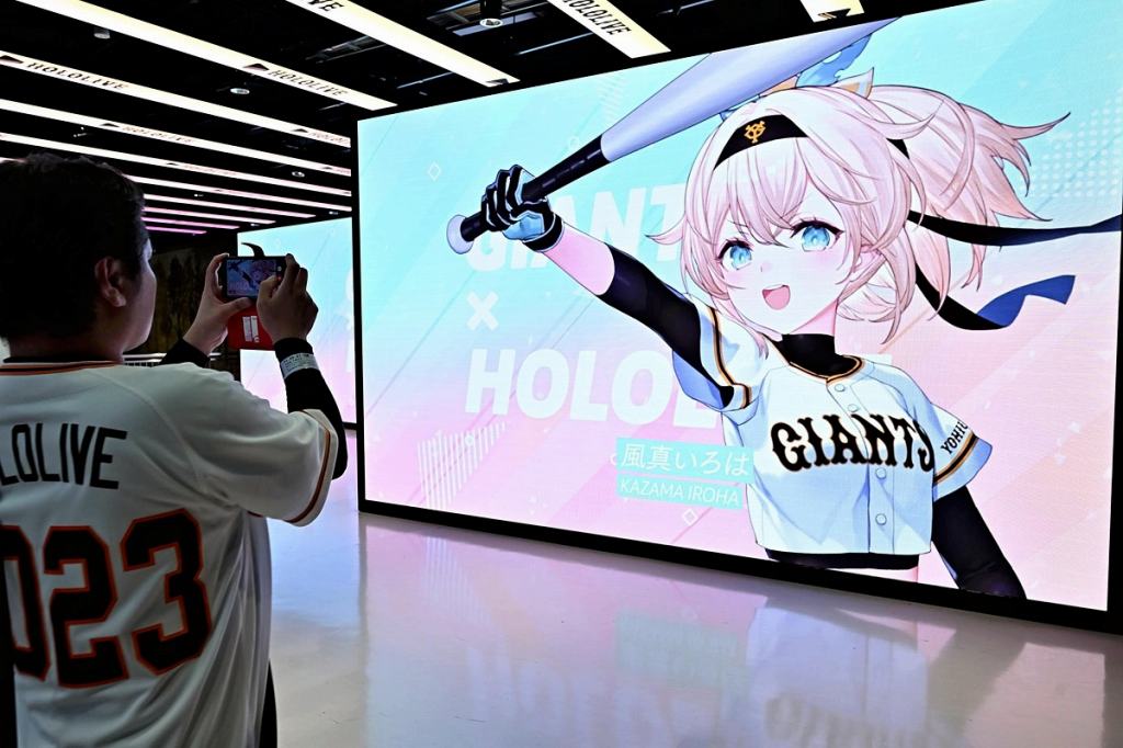A Hololive character is seen on a screen at a Yomiuri Giants game.