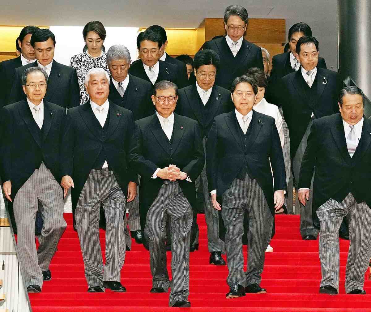 Prime Minister Shigeru Ishiba, center, and other ministers descend a stairway for commemorative photos on Tuesday at the Prime Minister’s Office in Tokyo.