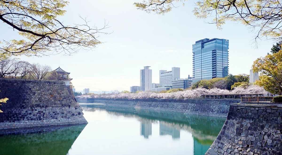 The exterior of the Patina Osaka hotel as seen from Osaka Castle Park