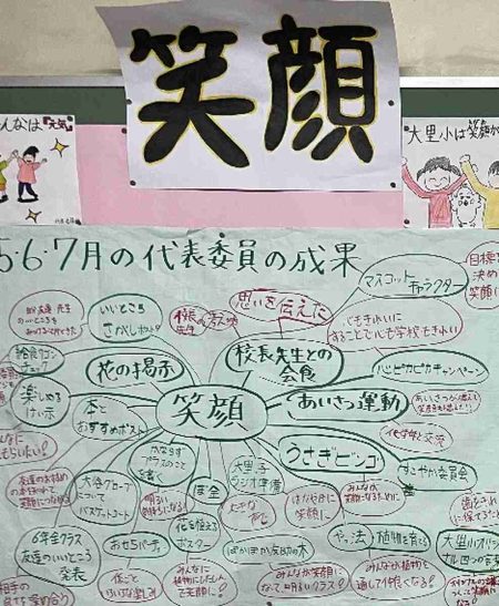To improve school life, the representative council set this year’s school slogan as “Let’s All Smile” and, in the first term, carried out a variety of initiatives to promote communication across the school. In one campaign using worksheets, students adopted 15 small goals such as “Make eye contact when greeting,” “Say hello with a cheerful voice,” and “Say ‘great job’ to at least 10 people.” Classes colored in the relevant parts of their worksheets when 80% of the class met a goal.