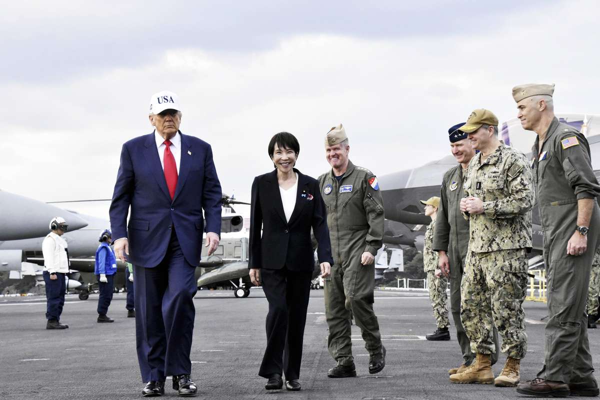 Prime Minister Sanae Takaichi and U.S. President Donald Trump arrive aboard the aircraft carrier USS George Washington on Oct. 28, 2025, in Yokosuka, Kanagawa Prefecture.