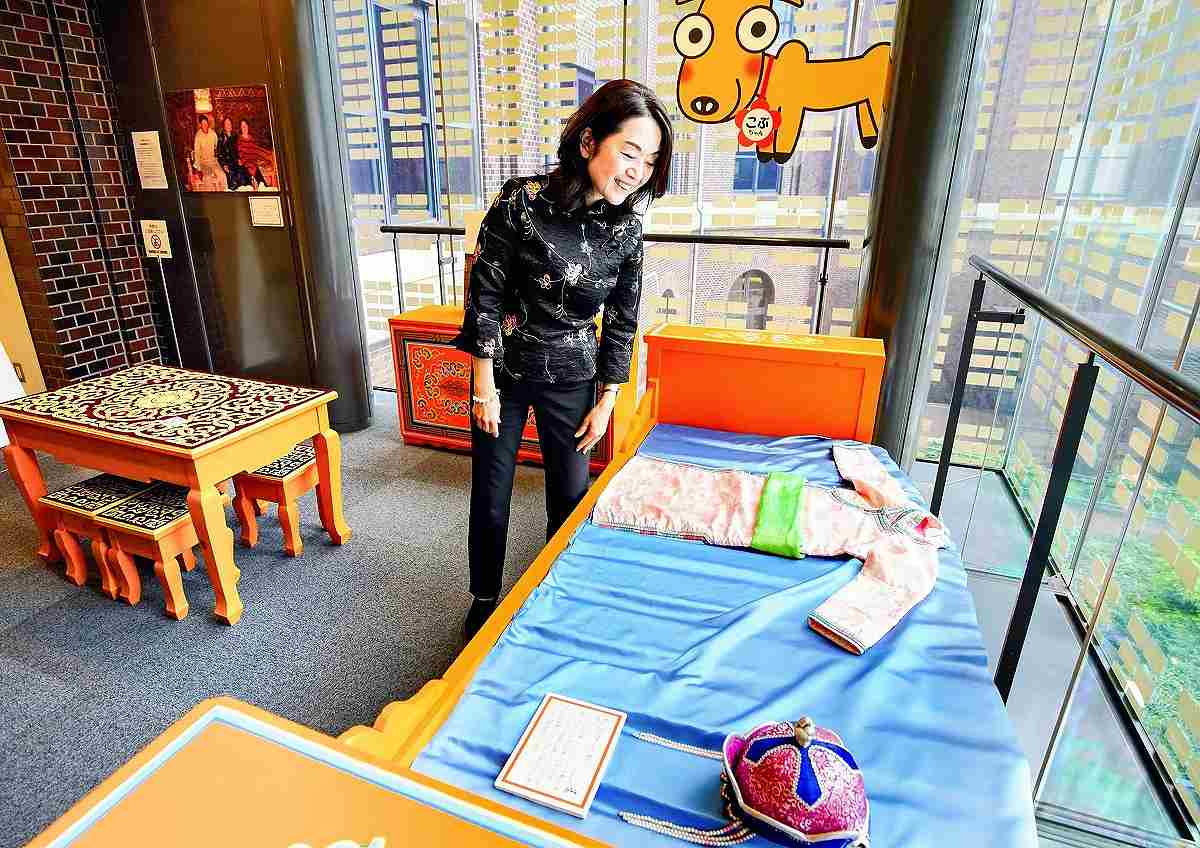 At the entrance, there is a bright orange bed in a reproduction of the inside of a ger, a portable round tent with a collapsible frame that nomadic Mongolians use as a dwelling. One side of the bed is curved so it fits well within the ger. This piece of furniture is popular with children because it evokes the world of the folktale “Suho’s White Horse.”